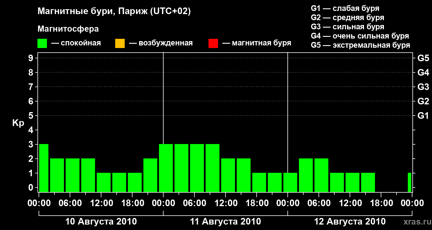 Изменения геомагнитного индекса Kp с 10 по 12 августа 2010 года для средних широт