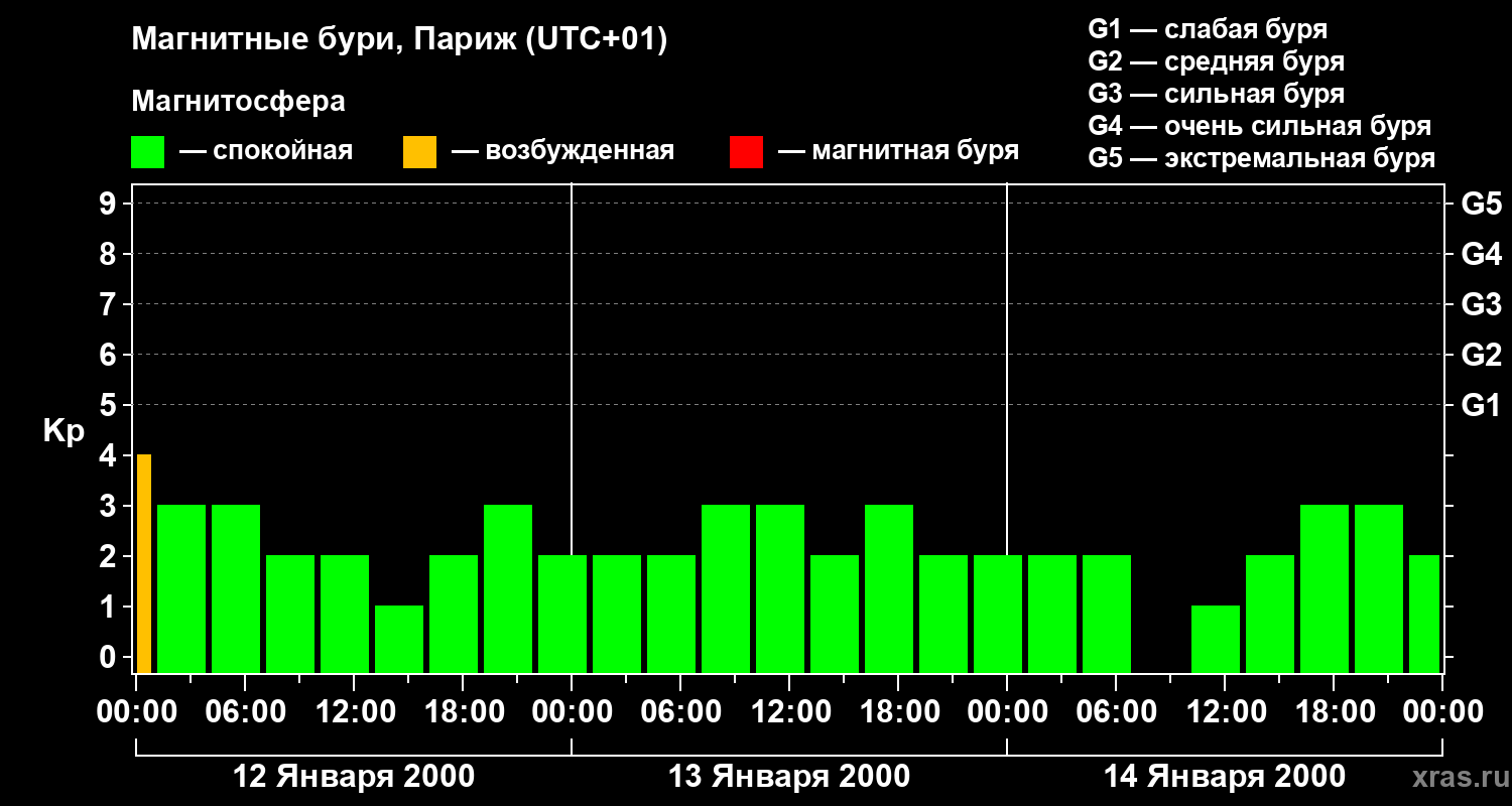 Изменения геомагнитного индекса Kp с 12 по 14 января 2000 года для средних широт
