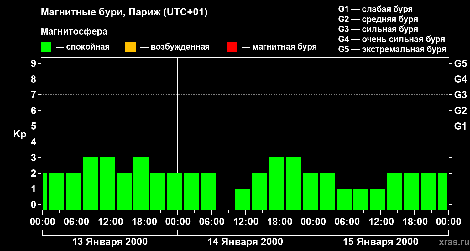 Изменения геомагнитного индекса Kp с 13 по 15 января 2000 года для средних широт