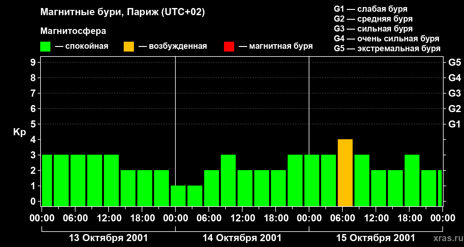 Изменения геомагнитного индекса Kp с 13 по 15 октября 2001 года для средних широт