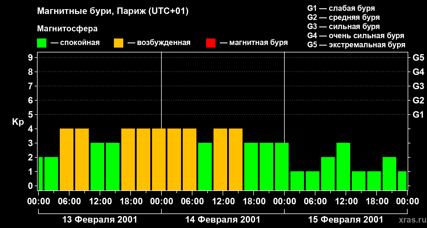 Изменения геомагнитного индекса Kp с 13 по 15 февраля 2001 года для средних широт