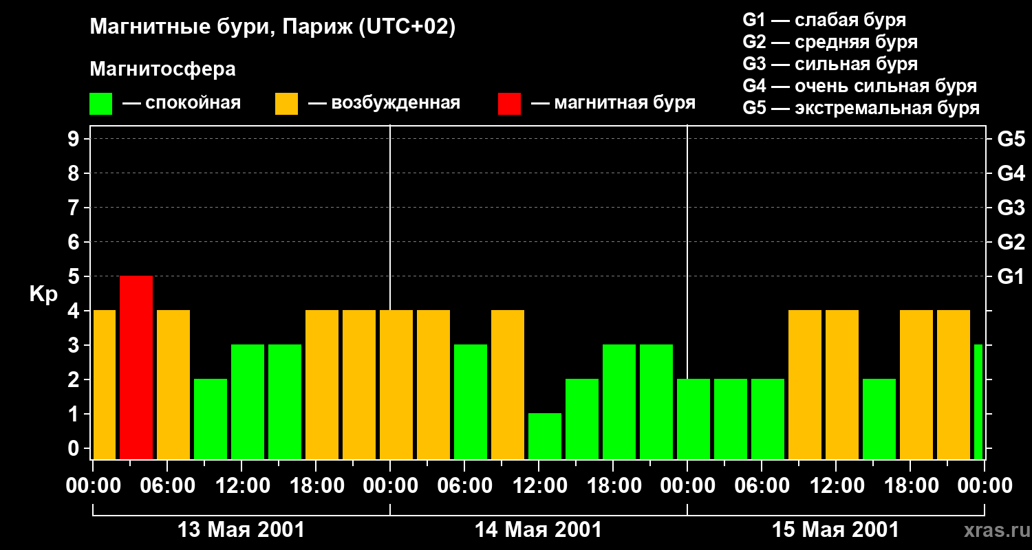 Изменения геомагнитного индекса Kp с 13 по 15 мая 2001 года для средних широт