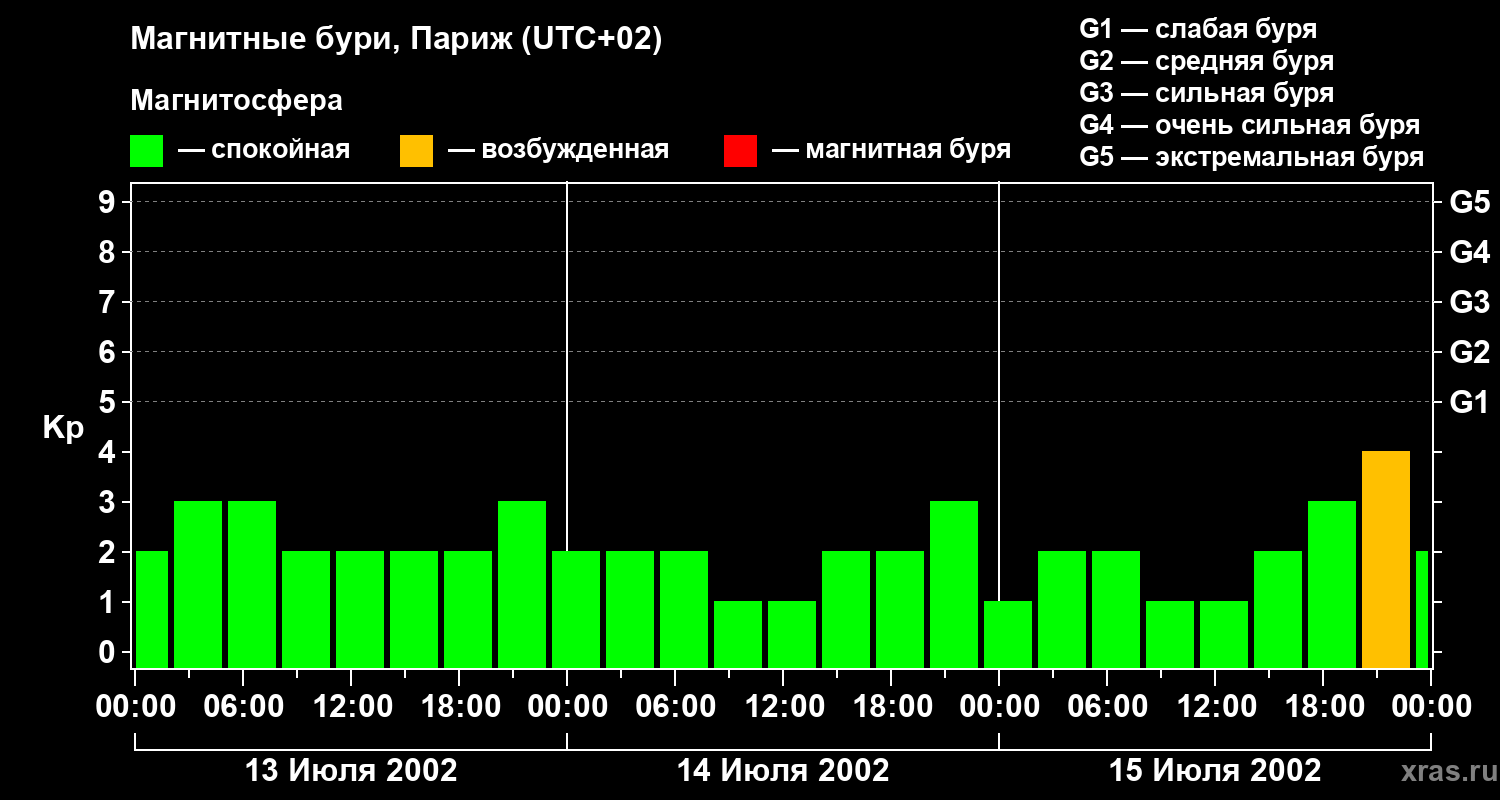 Изменения геомагнитного индекса Kp с 13 по 15 июля 2002 года для средних широт