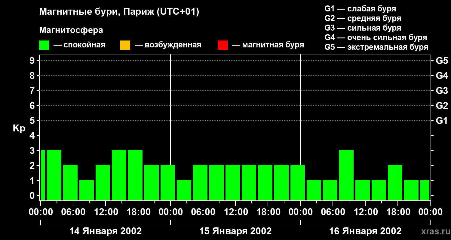 Изменения геомагнитного индекса Kp с 14 по 16 января 2002 года для средних широт