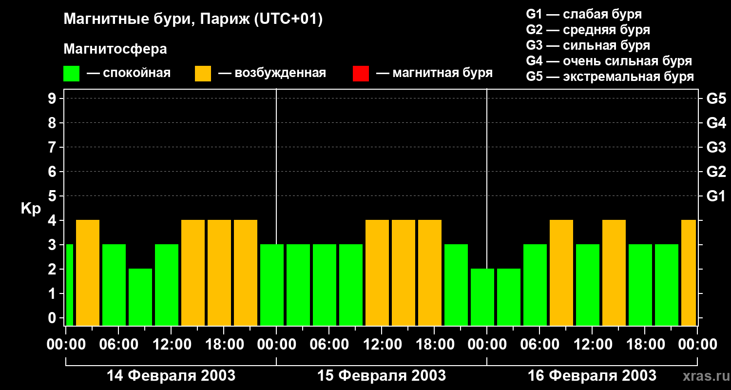 Изменения геомагнитного индекса Kp с 14 по 16 февраля 2003 года для средних широт