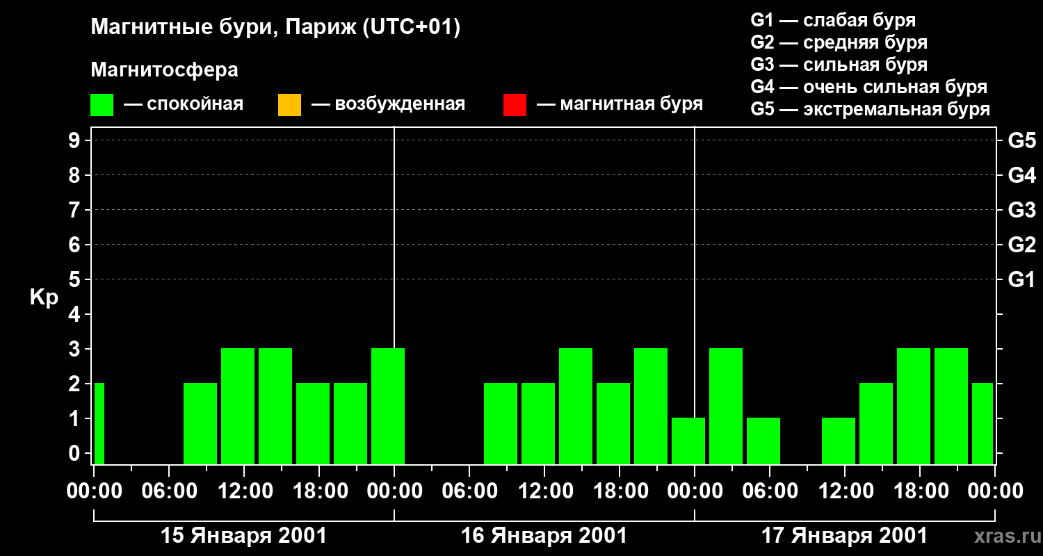 Изменения геомагнитного индекса Kp с 15 по 17 января 2001 года для средних широт