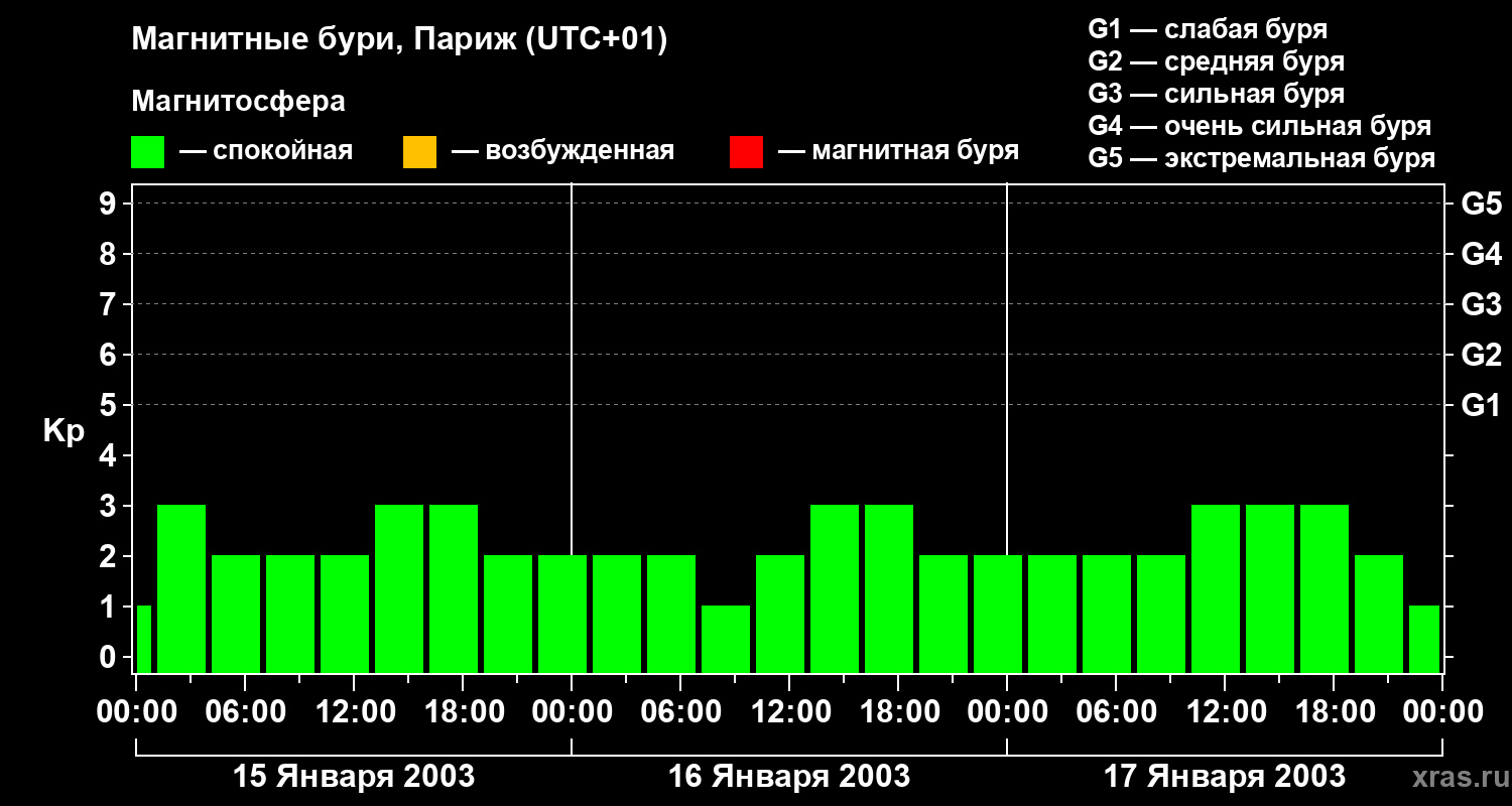 Изменения геомагнитного индекса Kp с 15 по 17 января 2003 года для средних широт