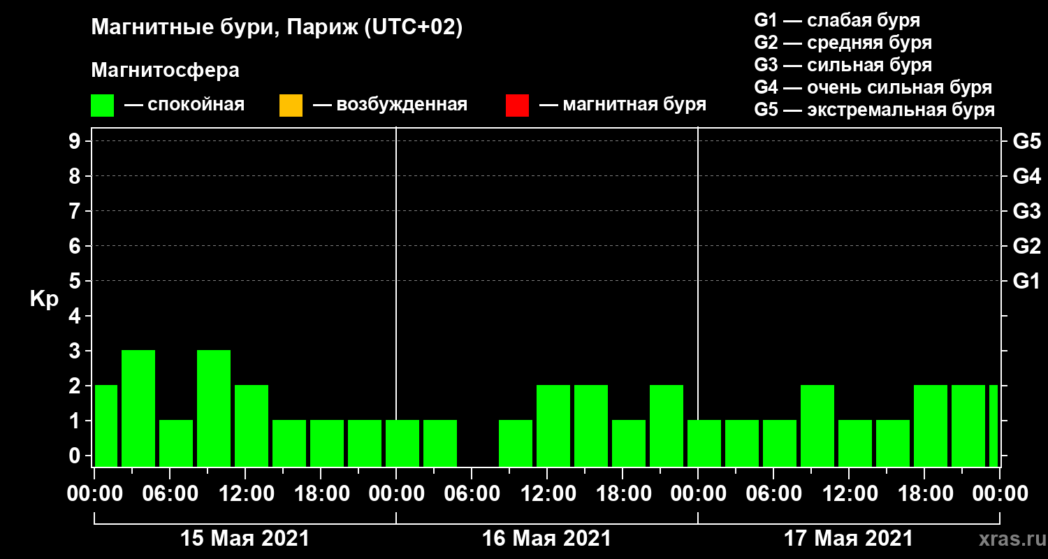Изменения геомагнитного индекса Kp с 15 по 17 мая 2021 года для средних широт