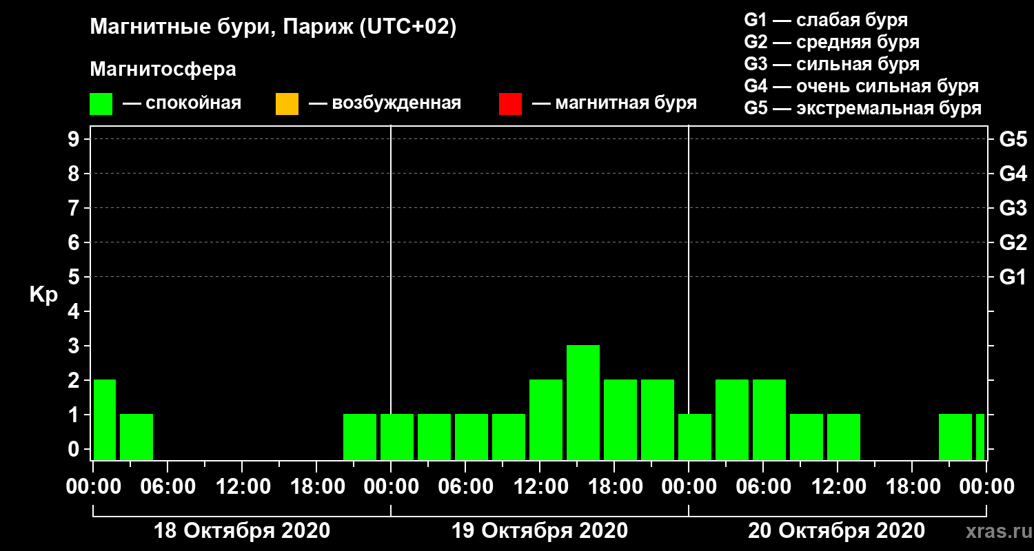 Изменения геомагнитного индекса Kp с 18 по 20 октября 2020 года для средних широт
