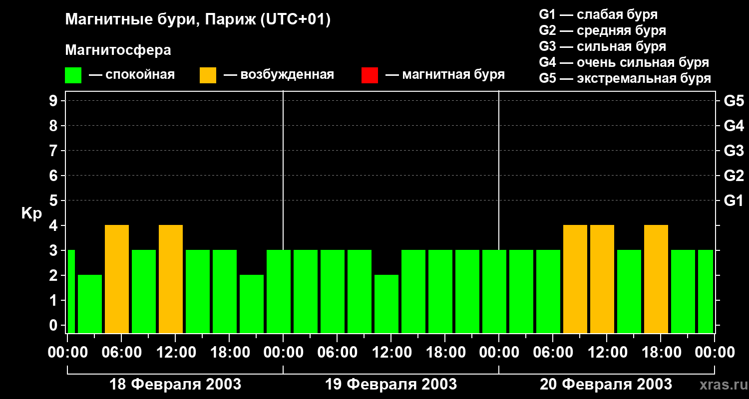 Изменения геомагнитного индекса Kp с 18 по 20 февраля 2003 года для средних широт