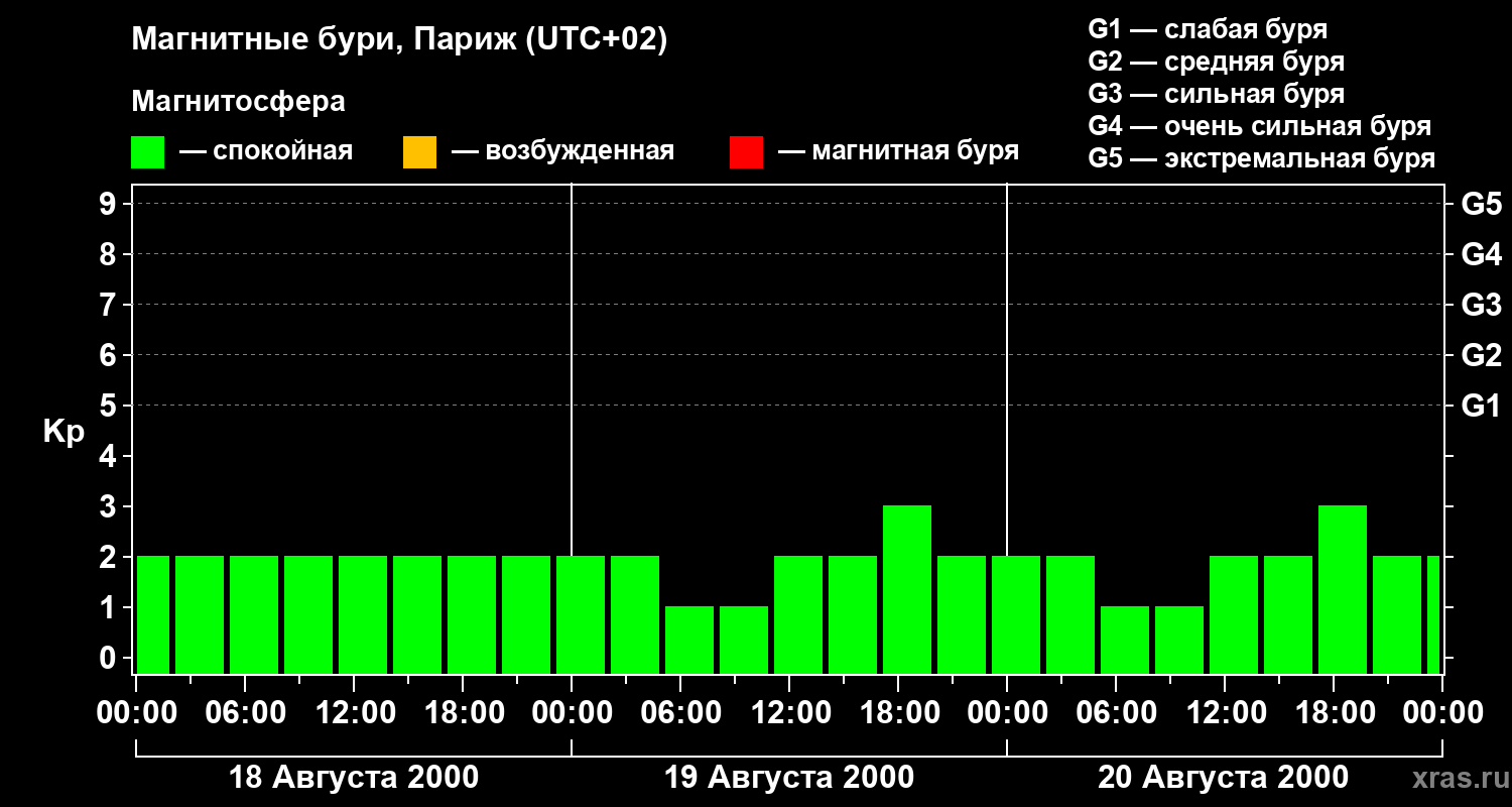Изменения геомагнитного индекса Kp с 18 по 20 августа 2000 года для средних широт