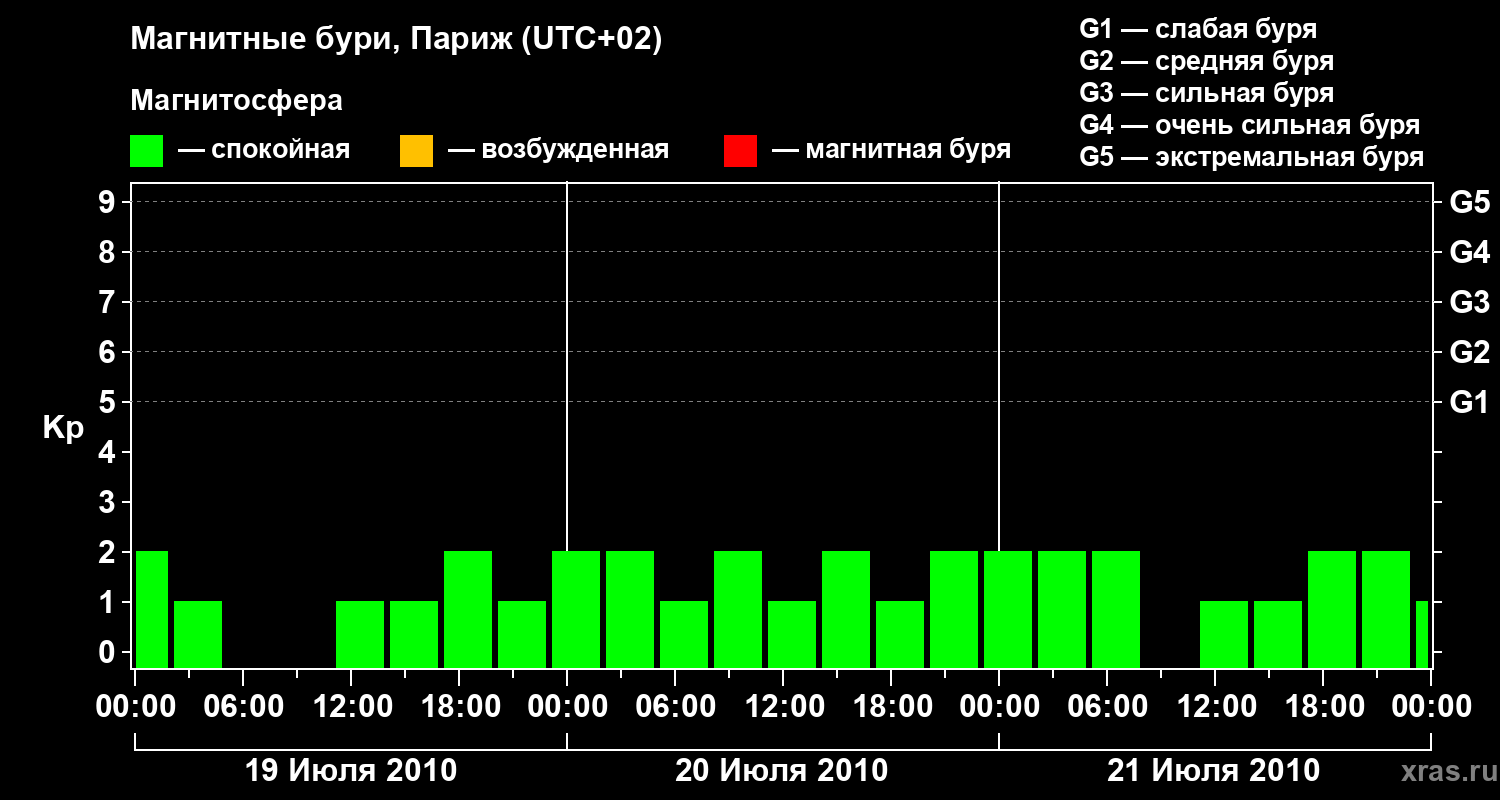 Изменения геомагнитного индекса Kp с 19 по 21 июля 2010 года для средних широт