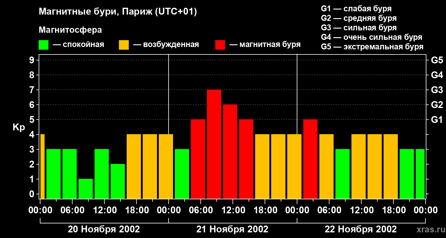Изменения геомагнитного индекса Kp с 20 по 22 ноября 2002 года для средних широт