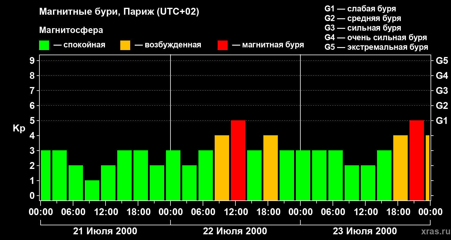 Изменения геомагнитного индекса Kp с 21 по 23 июля 2000 года для средних широт