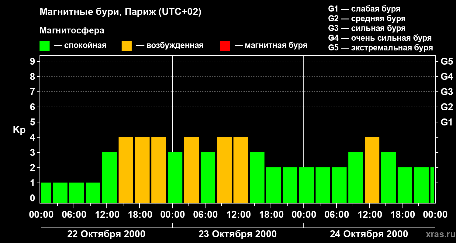 Изменения геомагнитного индекса Kp с 22 по 24 октября 2000 года для средних широт