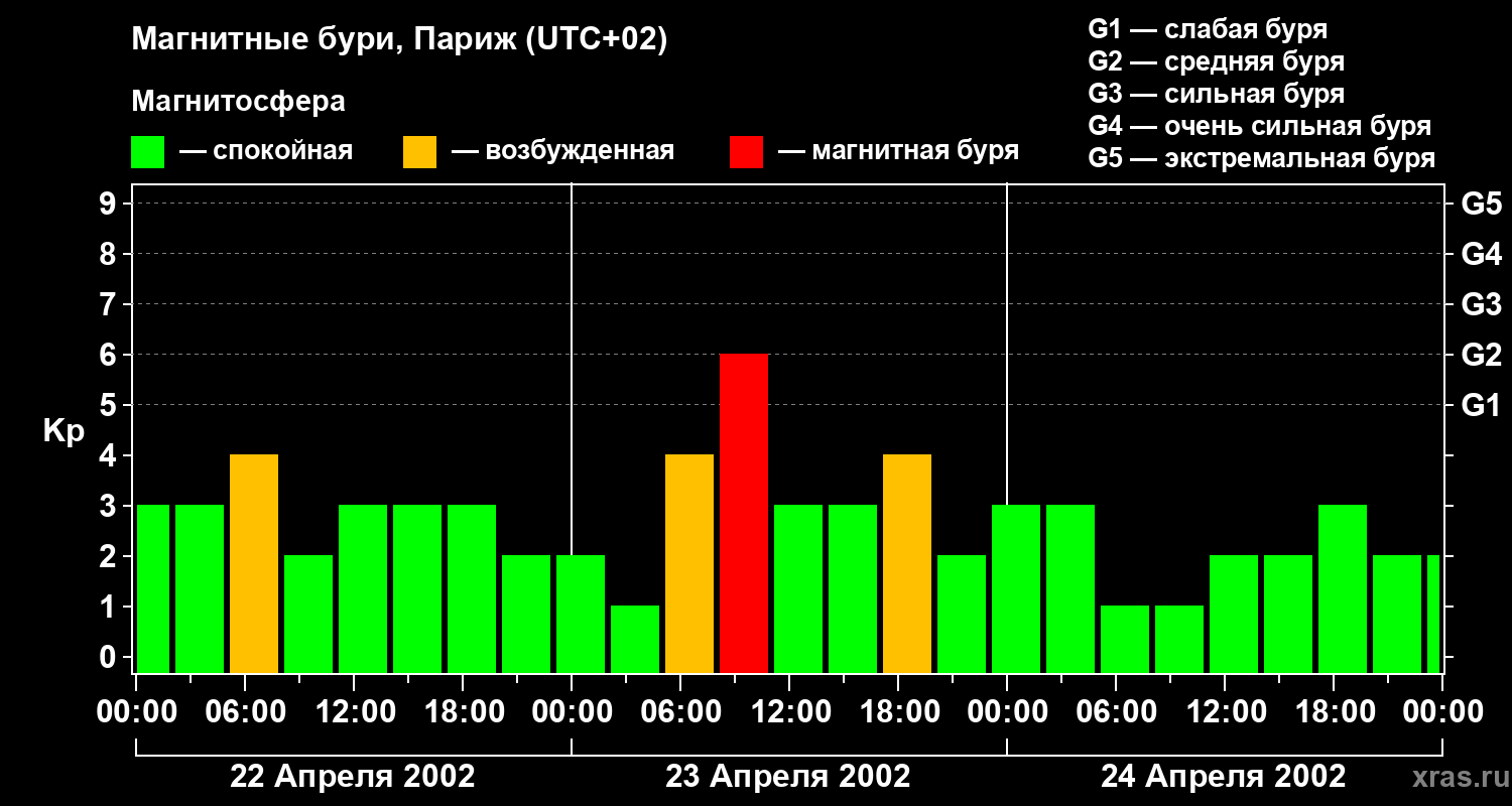 Изменения геомагнитного индекса Kp с 22 по 24 апреля 2002 года для средних широт