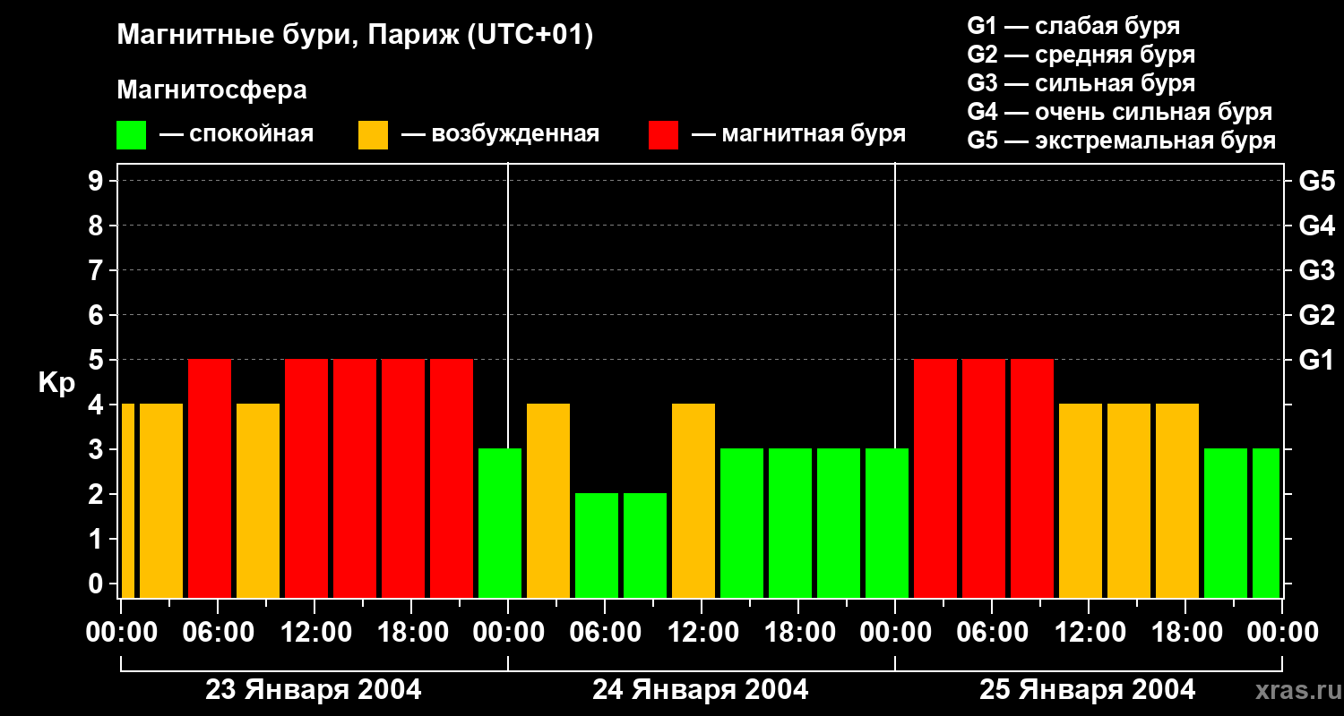 Изменения геомагнитного индекса Kp с 23 по 25 января 2004 года для средних широт