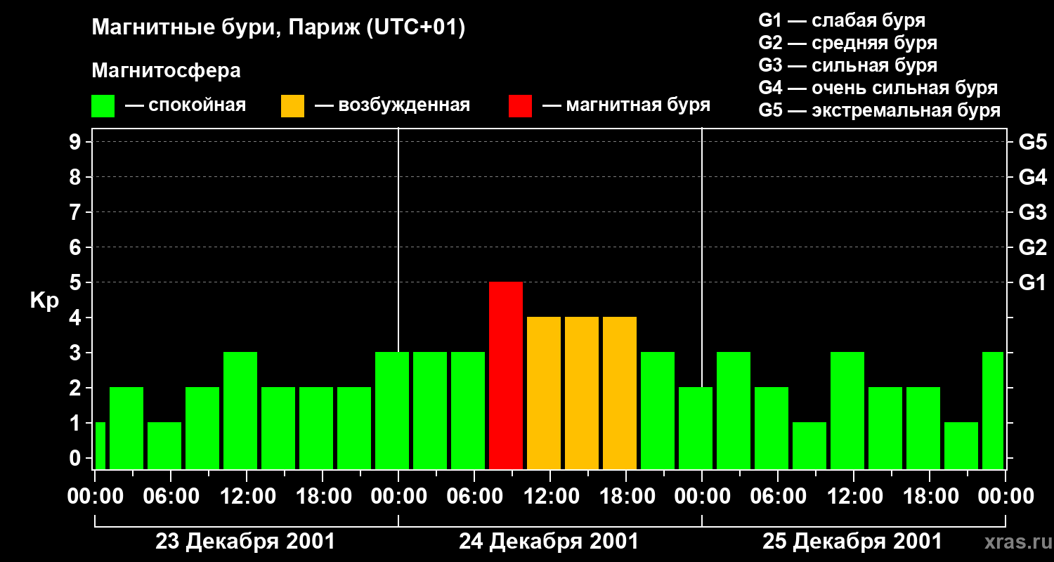 Изменения геомагнитного индекса Kp с 23 по 25 декабря 2001 года для средних широт