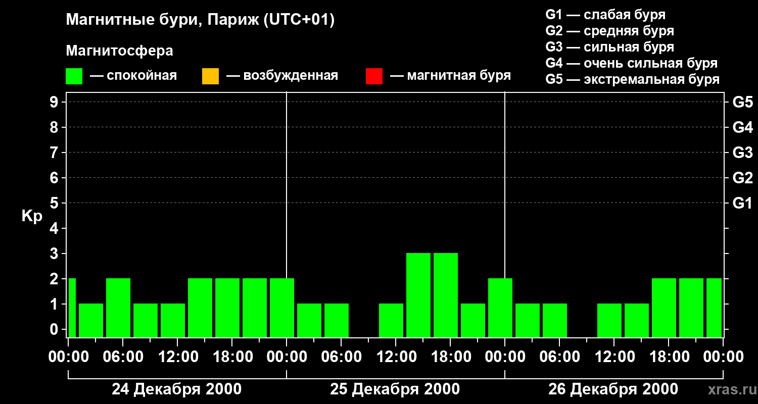 Изменения геомагнитного индекса Kp с 24 по 26 декабря 2000 года для средних широт