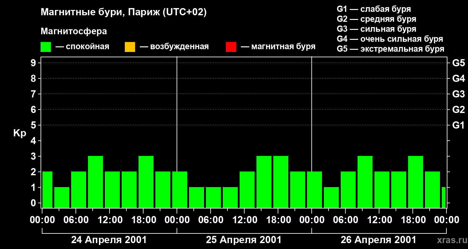 Изменения геомагнитного индекса Kp с 24 по 26 апреля 2001 года для средних широт