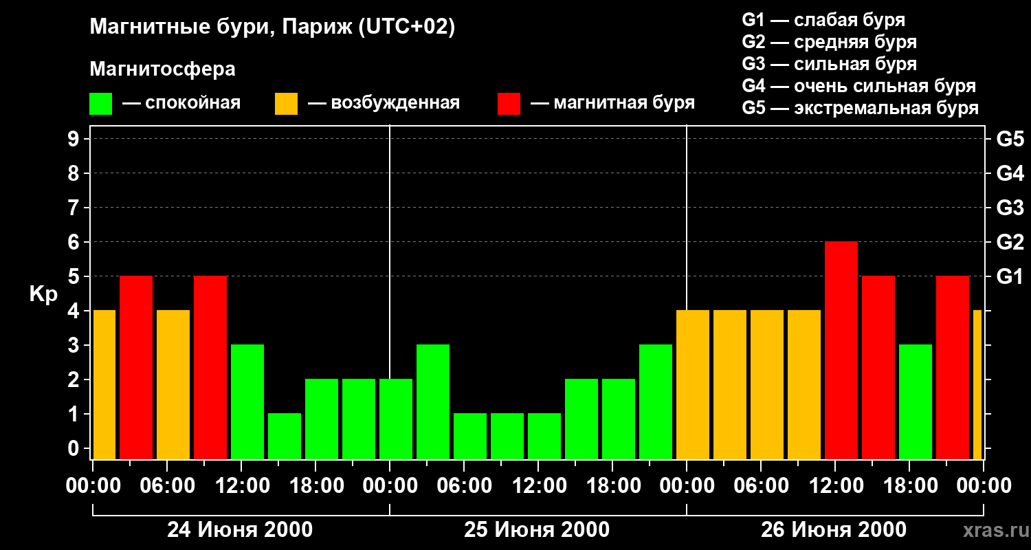 Изменения геомагнитного индекса Kp с 24 по 26 июня 2000 года для средних широт