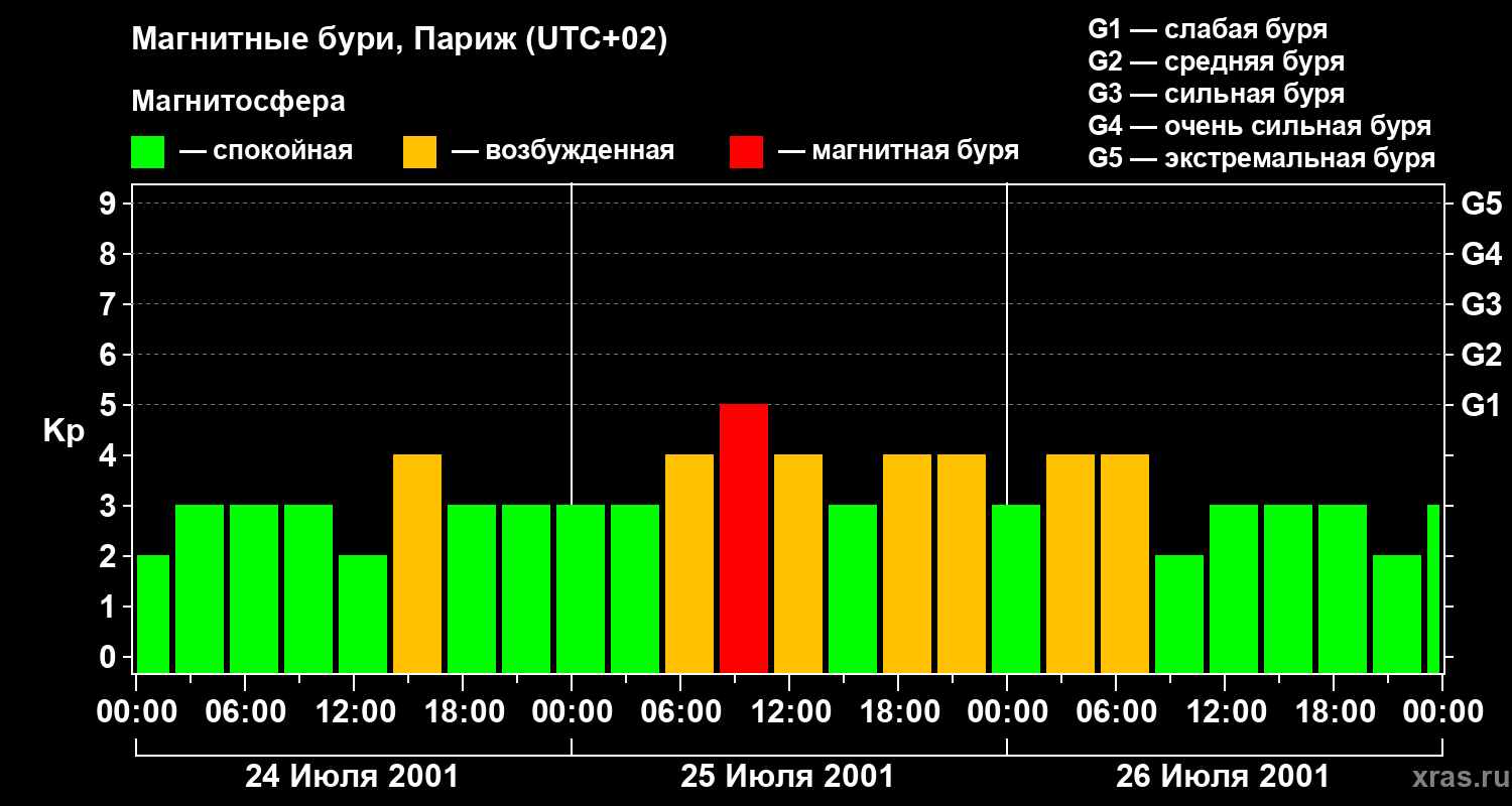 Изменения геомагнитного индекса Kp с 24 по 26 июля 2001 года для средних широт