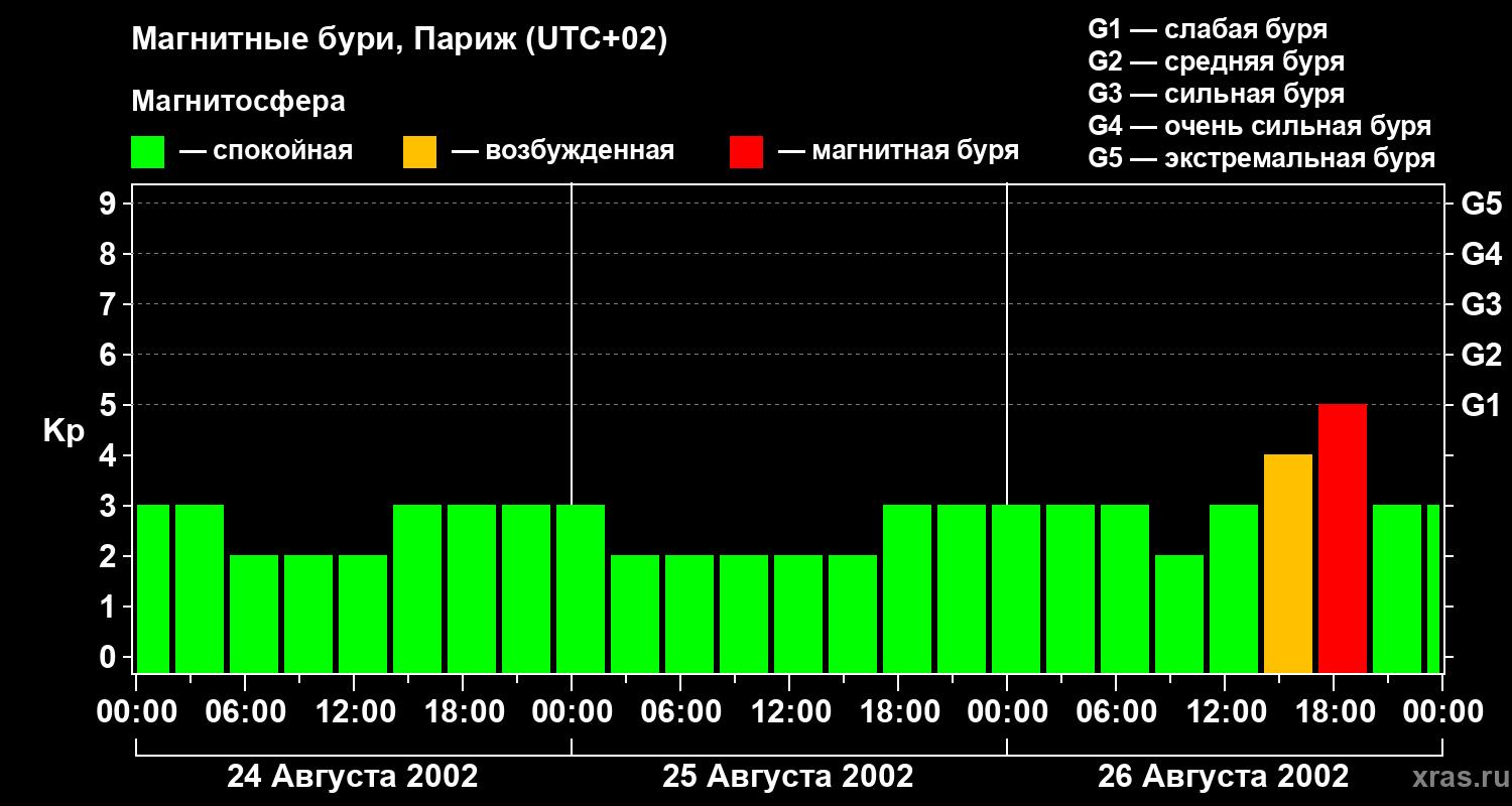 Изменения геомагнитного индекса Kp с 24 по 26 августа 2002 года для средних широт
