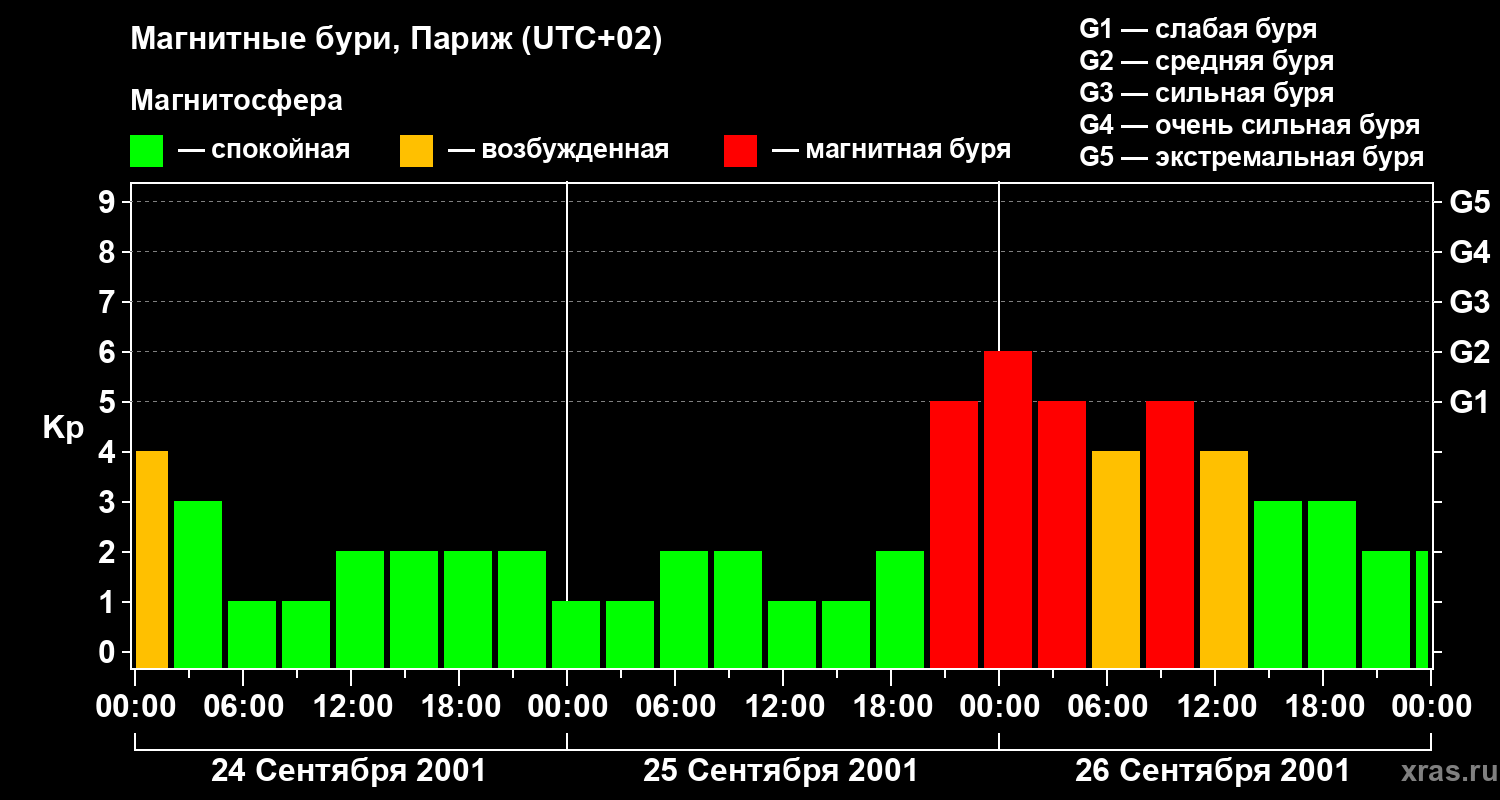 Изменения геомагнитного индекса Kp с 24 по 26 сентября 2001 года для средних широт