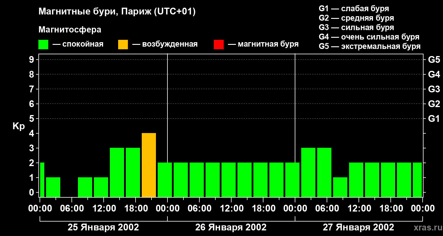 Изменения геомагнитного индекса Kp с 25 по 27 января 2002 года для средних широт