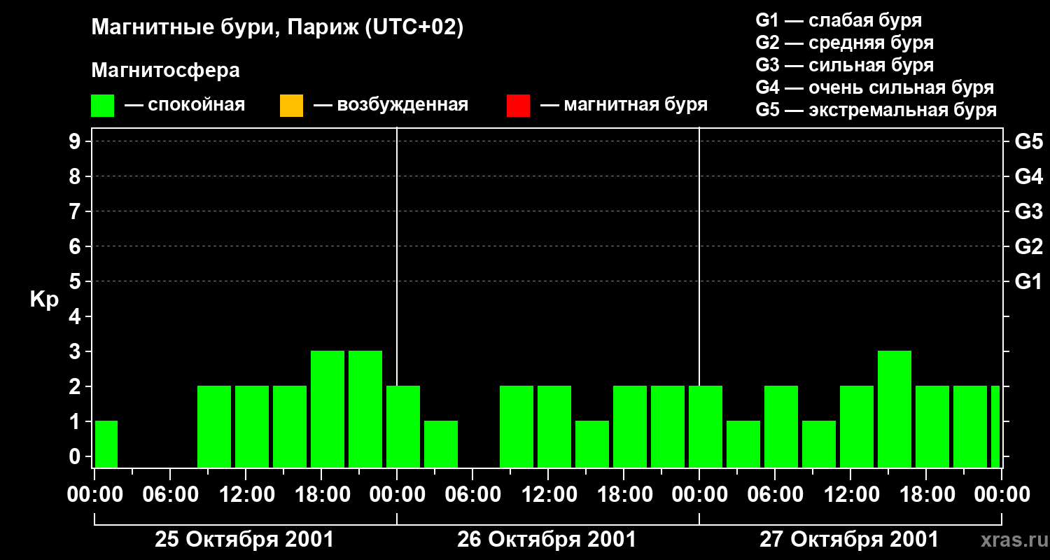 Изменения геомагнитного индекса Kp с 25 по 27 октября 2001 года для средних широт