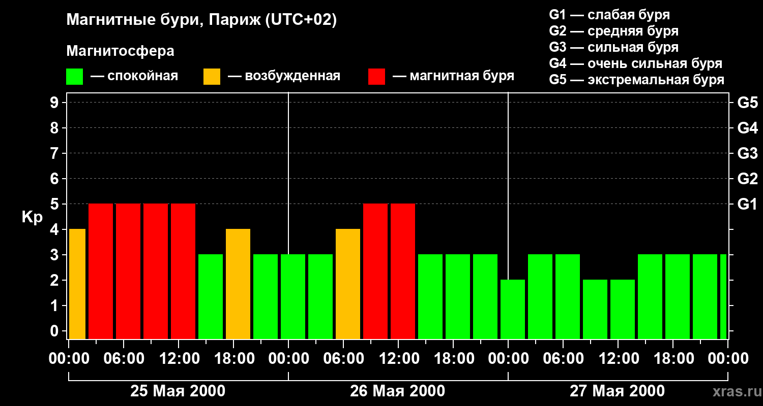 Изменения геомагнитного индекса Kp с 25 по 27 мая 2000 года для средних широт