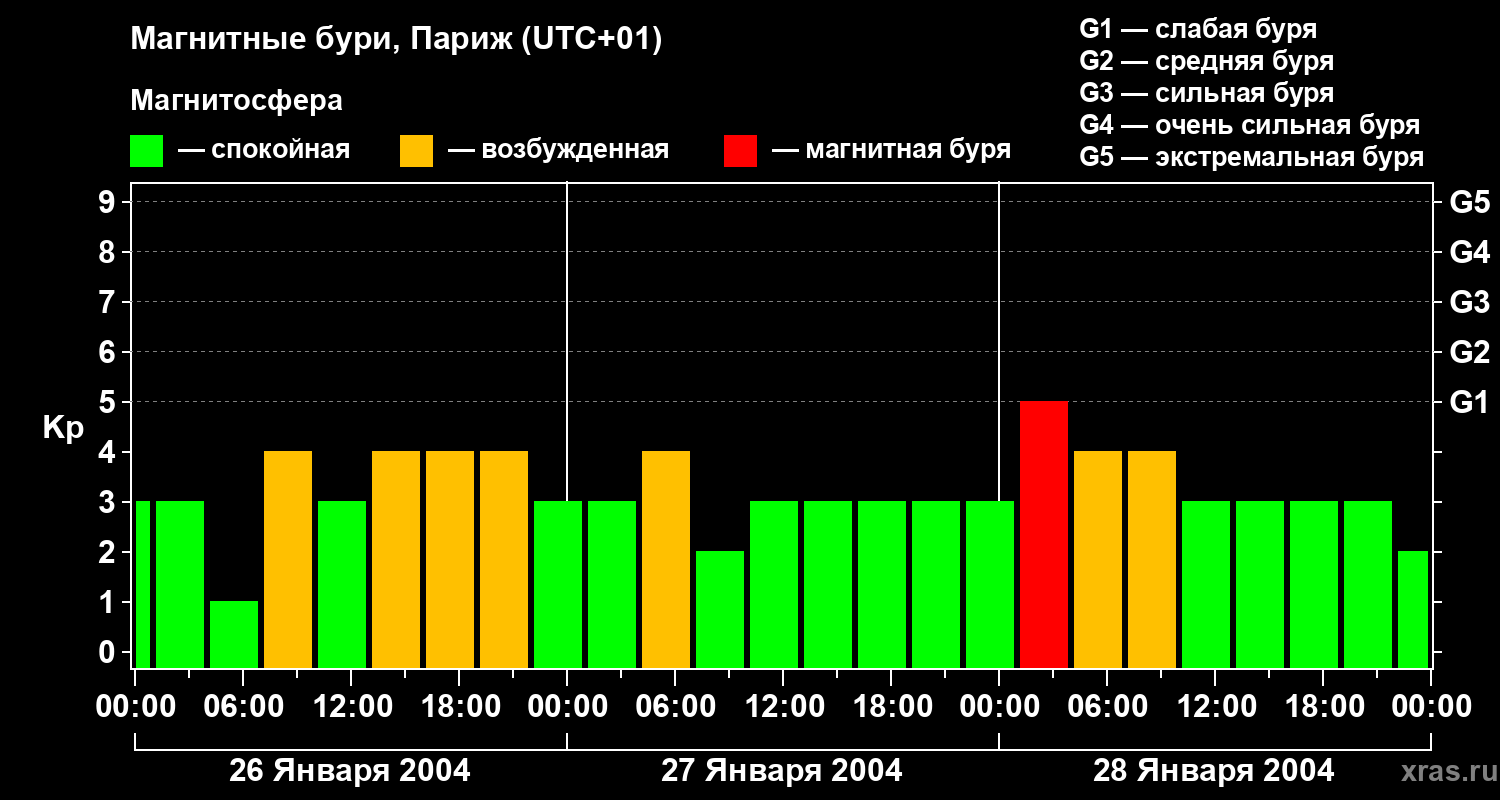 Изменения геомагнитного индекса Kp с 26 по 28 января 2004 года для средних широт