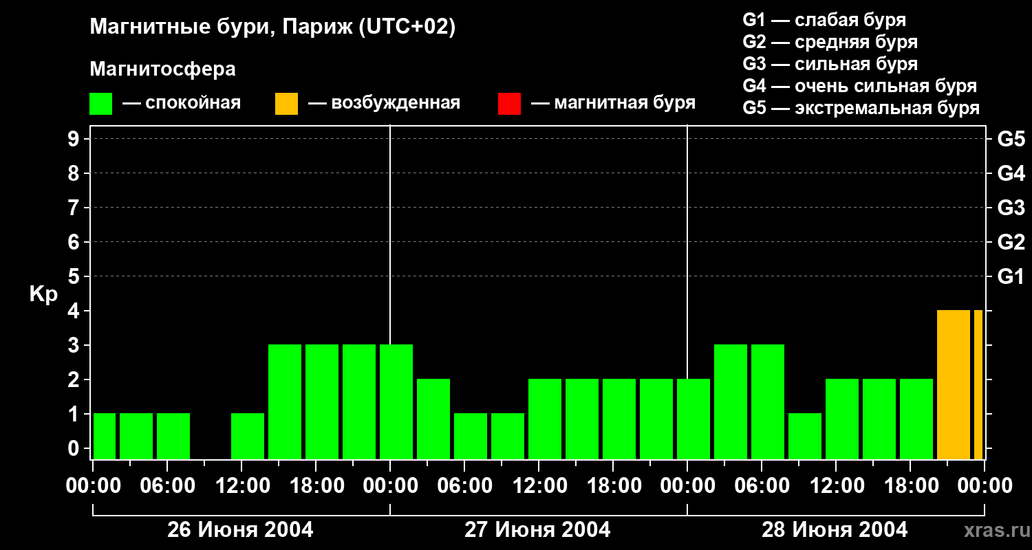 Изменения геомагнитного индекса Kp с 26 по 28 июня 2004 года для средних широт