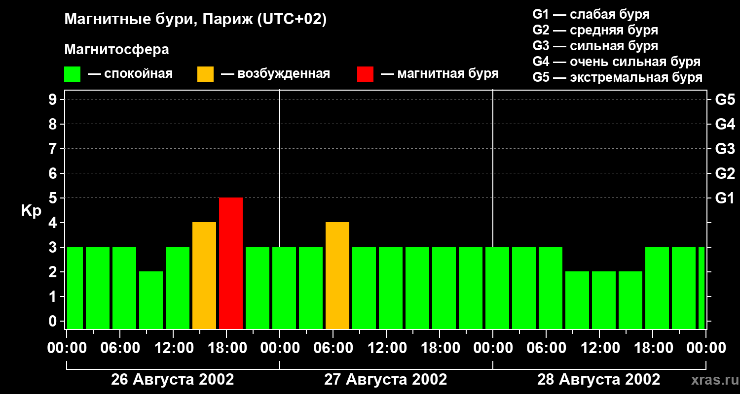 Изменения геомагнитного индекса Kp с 26 по 28 августа 2002 года для средних широт