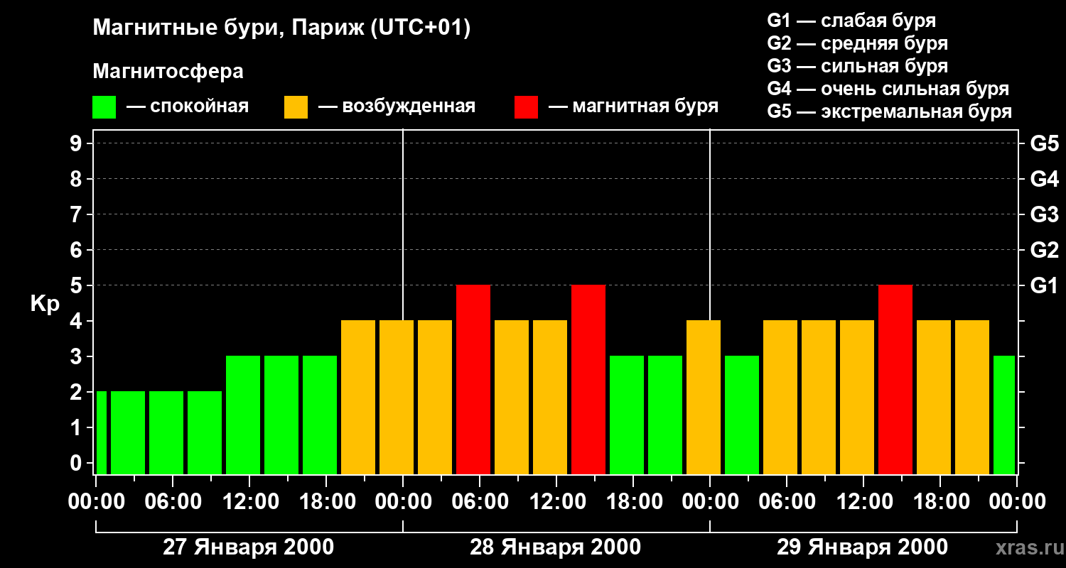 Изменения геомагнитного индекса Kp с 27 по 29 января 2000 года для средних широт