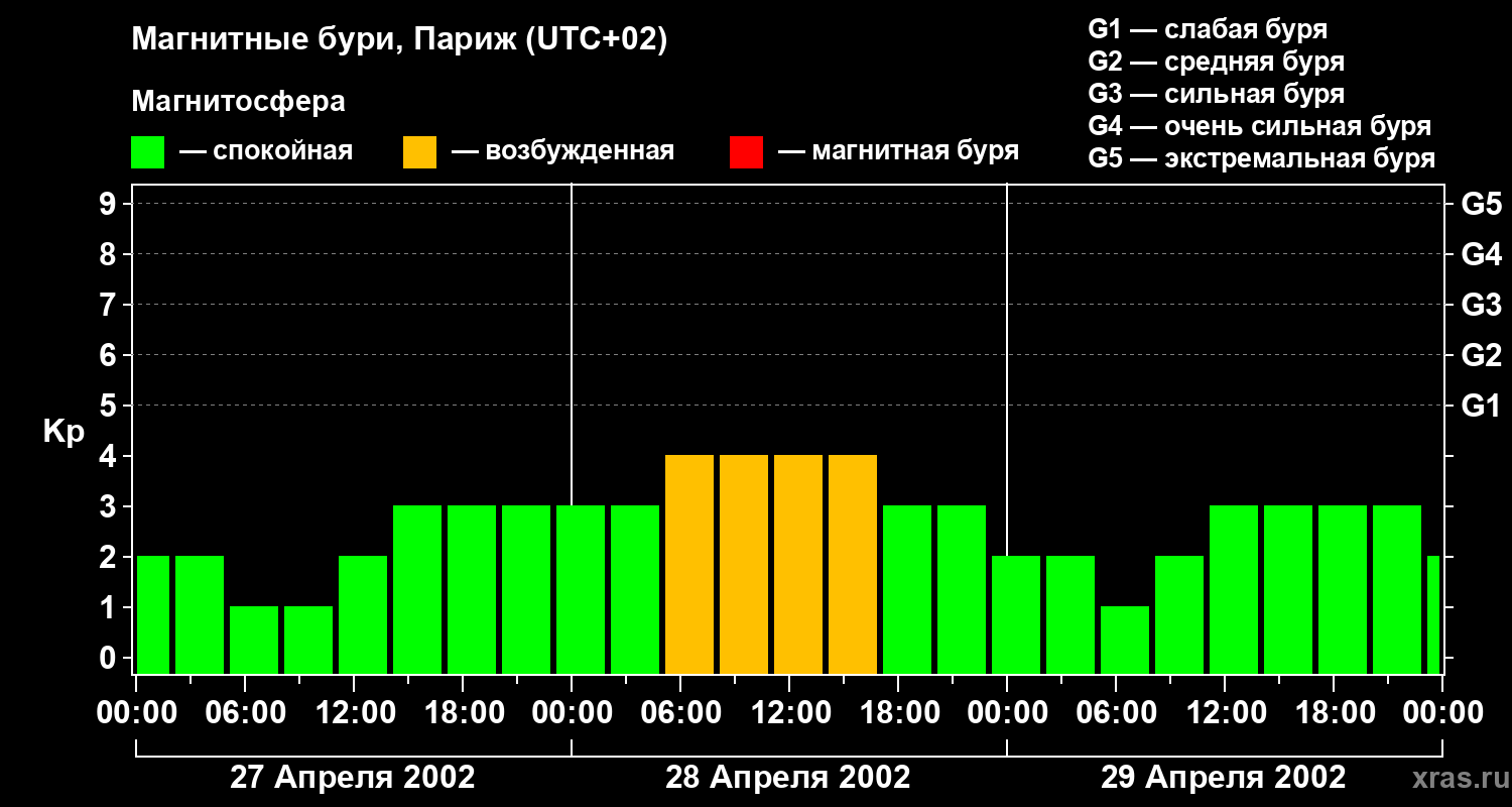 Изменения геомагнитного индекса Kp с 27 по 29 апреля 2002 года для средних широт
