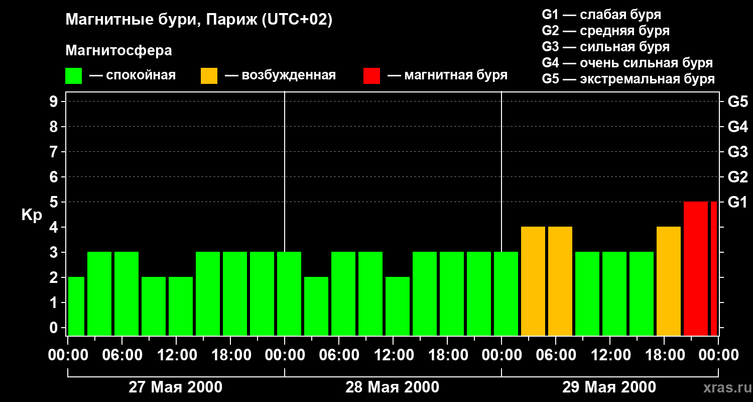 Изменения геомагнитного индекса Kp с 27 по 29 мая 2000 года для средних широт