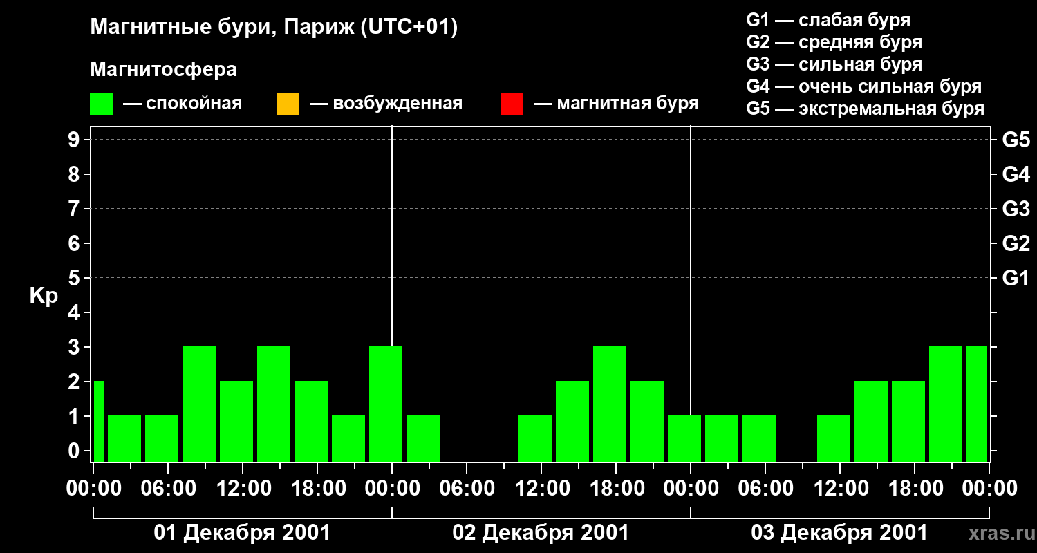 Изменения геомагнитного индекса Kp с 1 по 3 декабря 2001 года для средних широт