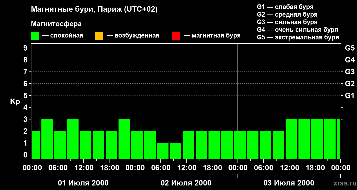 Изменения геомагнитного индекса Kp с 1 по 3 июля 2000 года для средних широт