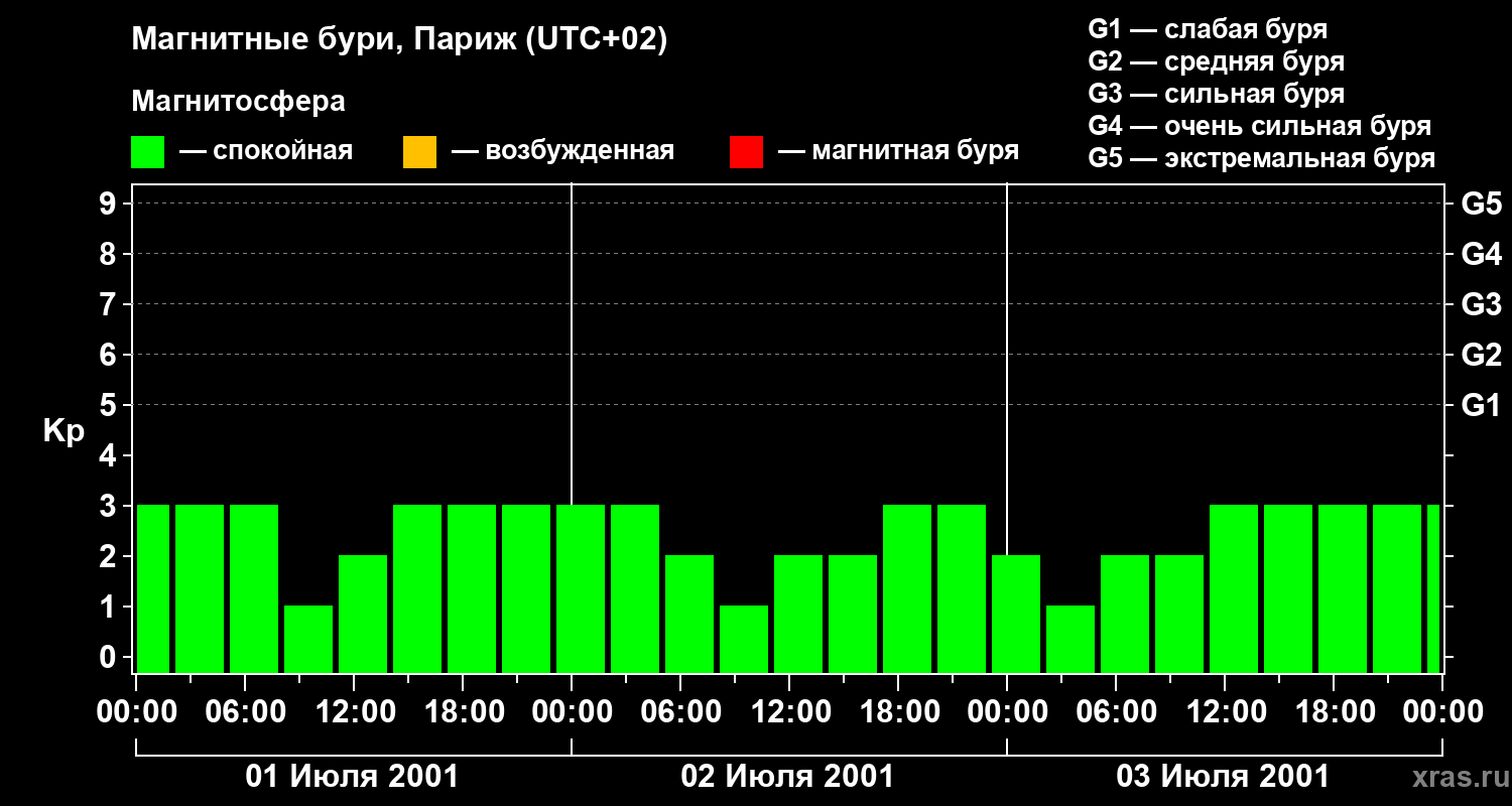 Изменения геомагнитного индекса Kp с 1 по 3 июля 2001 года для средних широт