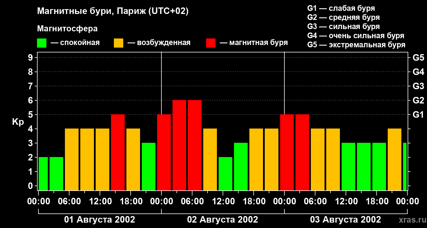 Изменения геомагнитного индекса Kp с 1 по 3 августа 2002 года для средних широт