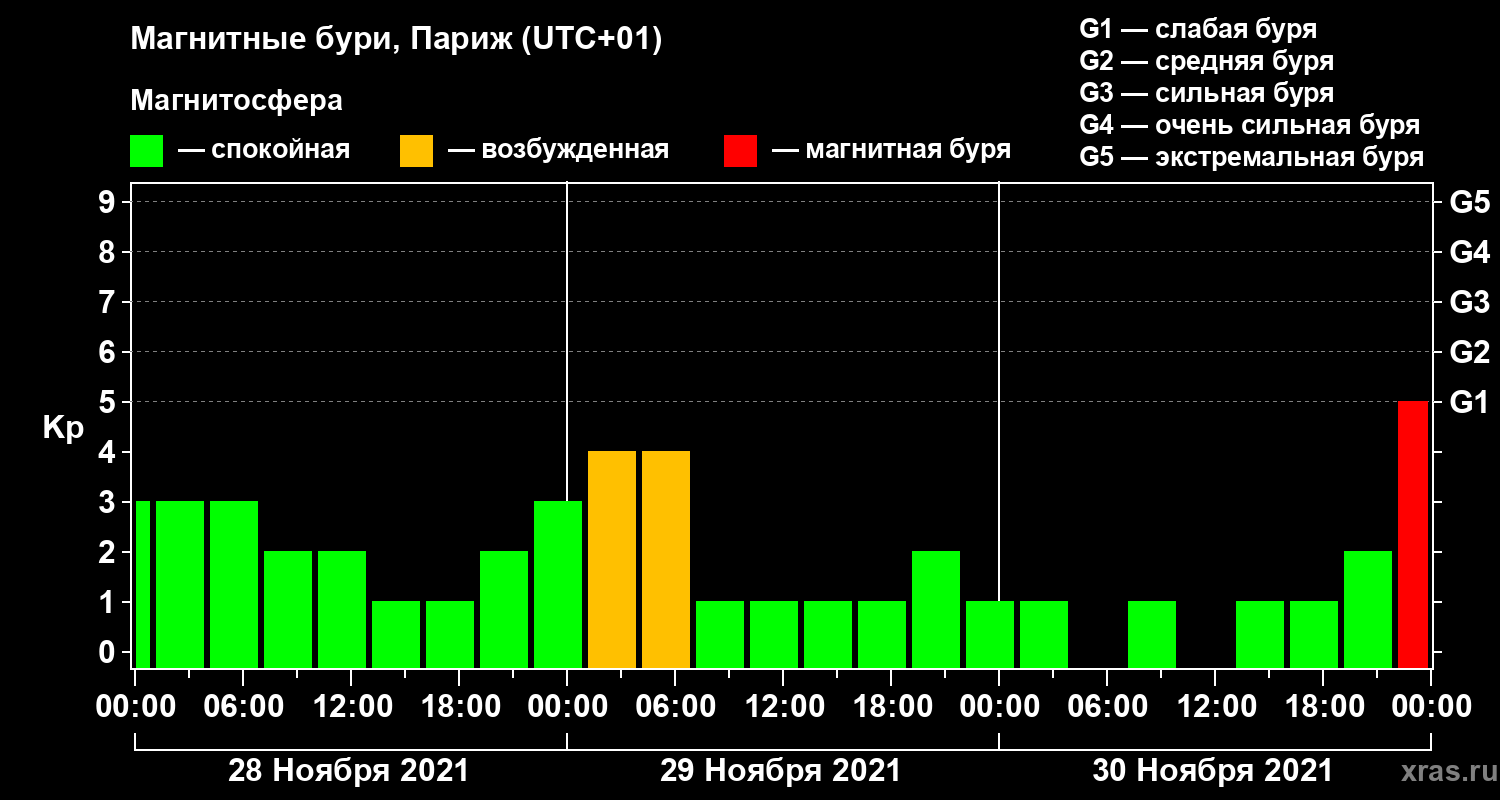 Изменения геомагнитного индекса Kp с 28 по 30 ноября 2021 года для средних широт