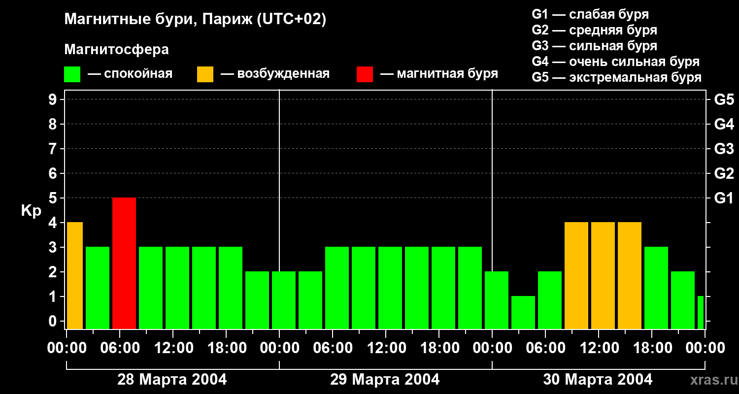 Изменения геомагнитного индекса Kp с 28 по 30 марта 2004 года для средних широт