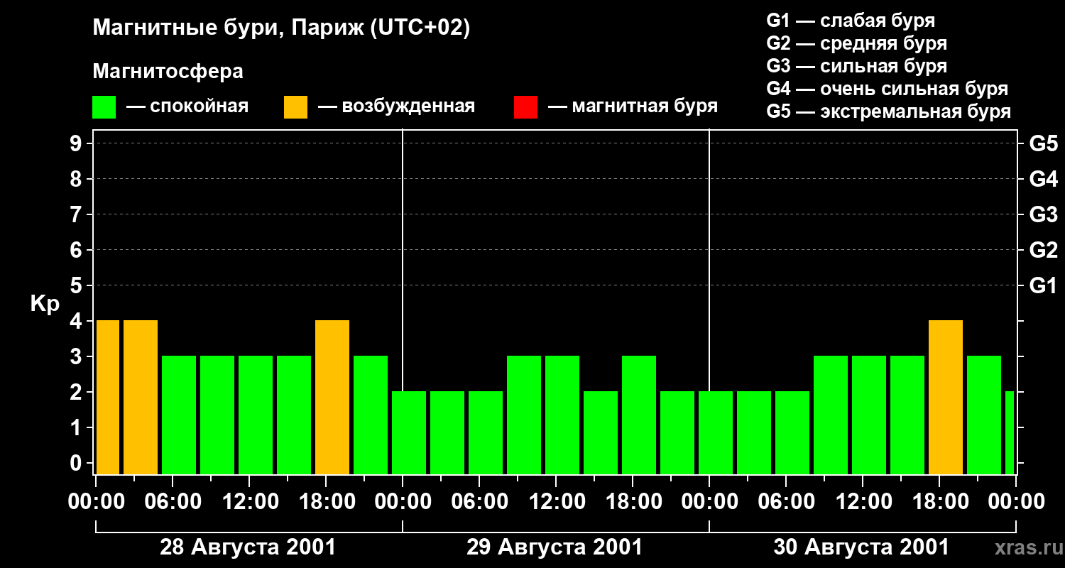 Изменения геомагнитного индекса Kp с 28 по 30 августа 2001 года для средних широт