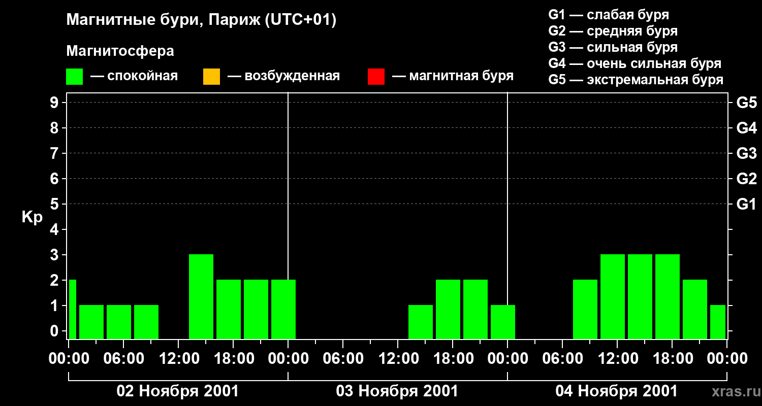 Изменения геомагнитного индекса Kp с 2 по 4 ноября 2001 года для средних широт