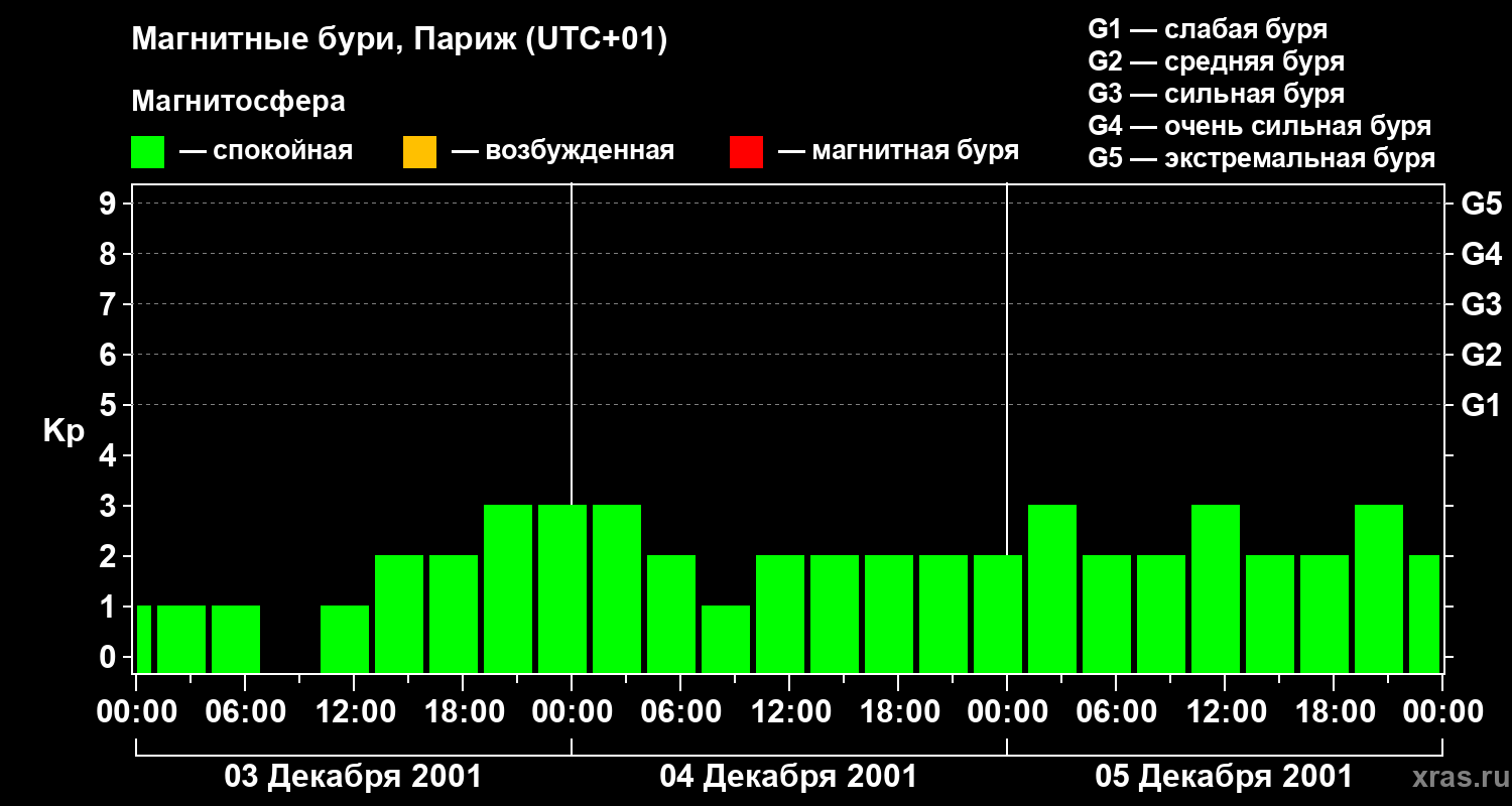 Изменения геомагнитного индекса Kp с 3 по 5 декабря 2001 года для средних широт