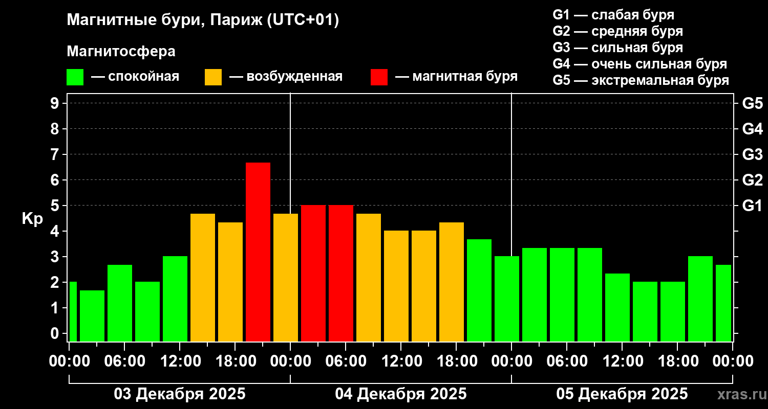 Изменения геомагнитного индекса Kp с 3 по 5 декабря 2025 года для средних широт