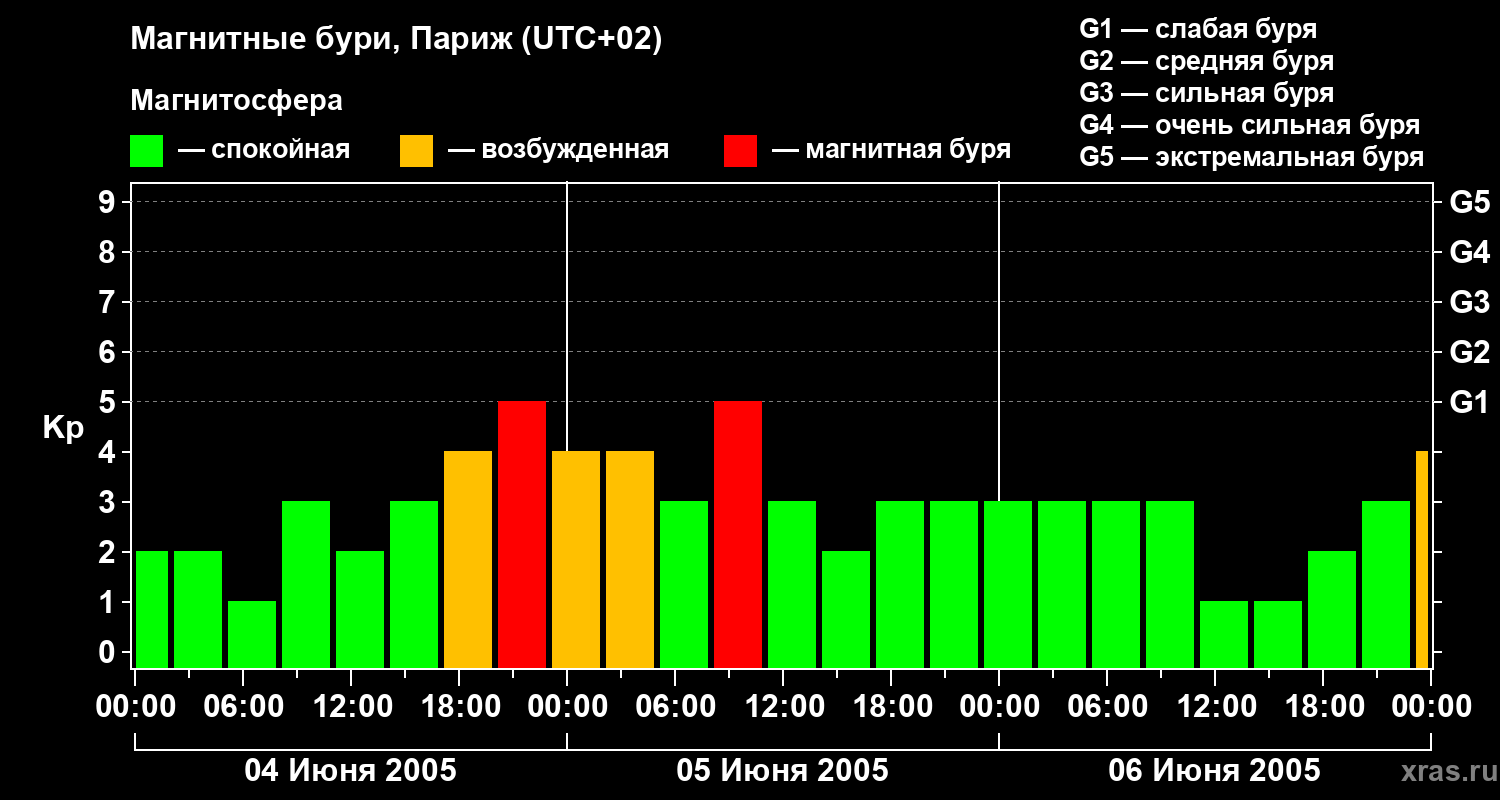 Изменения геомагнитного индекса Kp с 4 по 6 июня 2005 года для средних широт