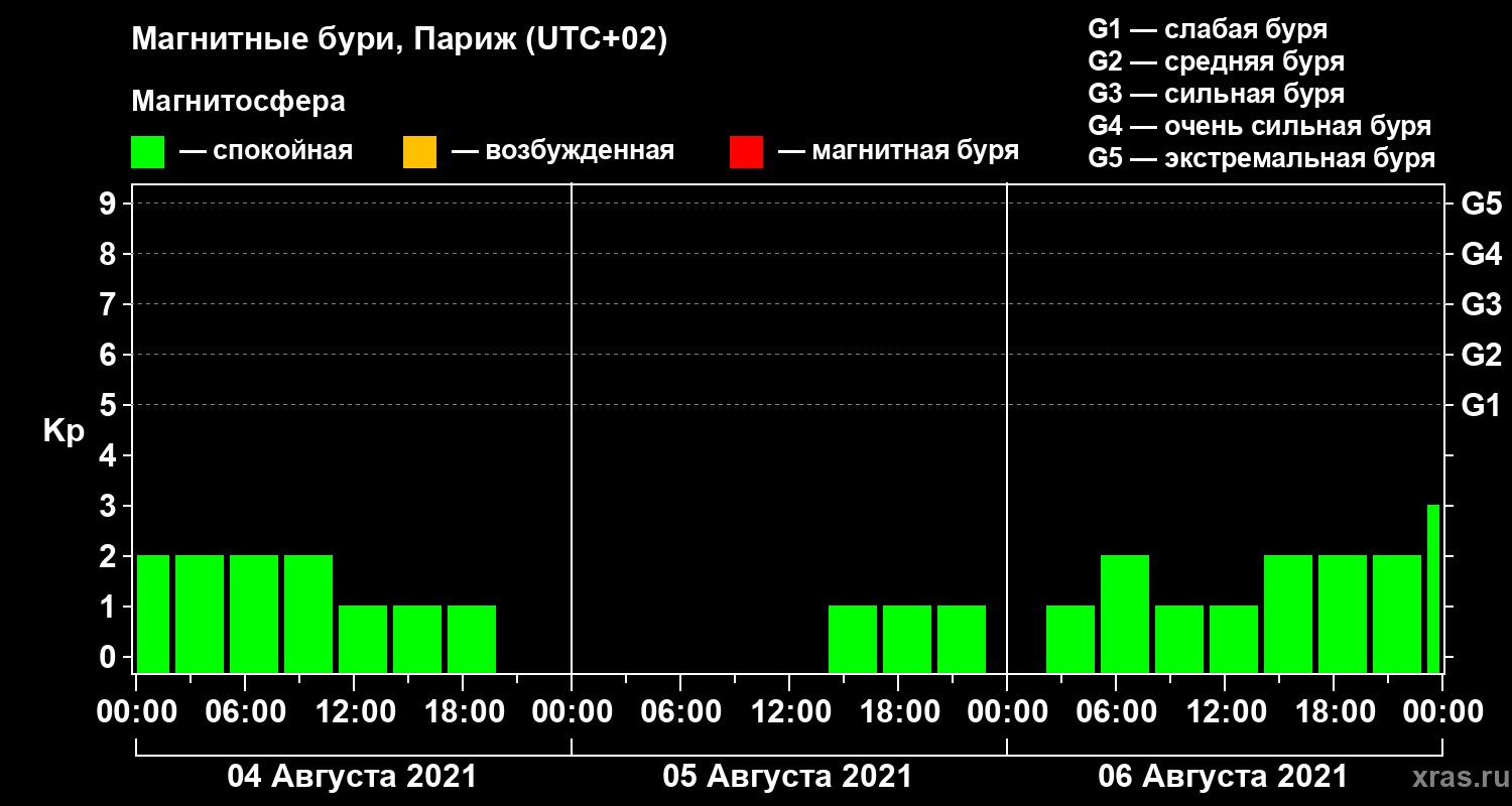 Изменения геомагнитного индекса Kp с 4 по 6 августа 2021 года для средних широт