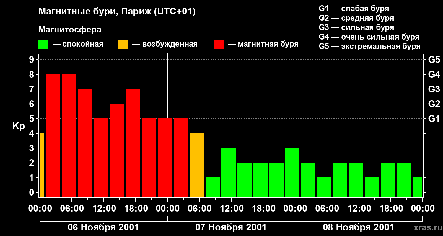 Изменения геомагнитного индекса Kp с 6 по 8 ноября 2001 года для средних широт